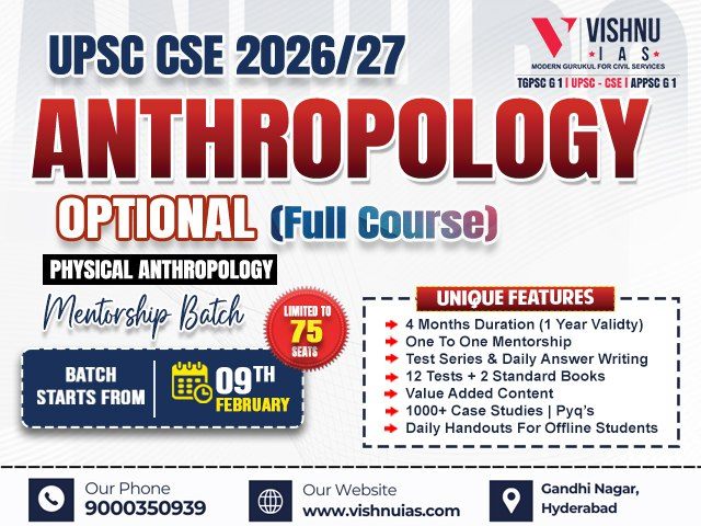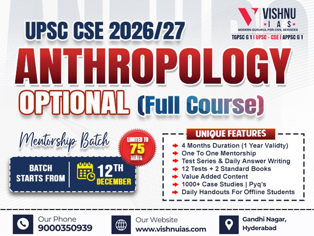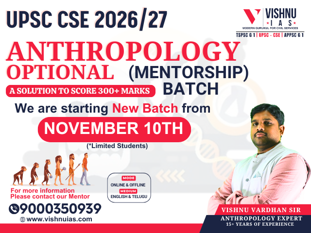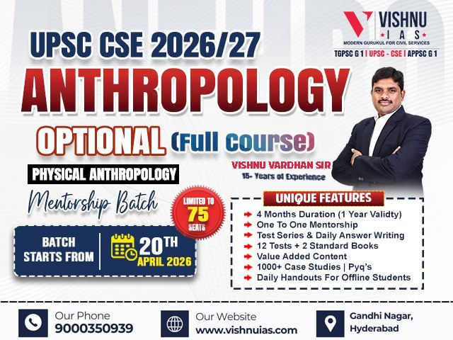 Vishnu IAS Academy is known for its Prestigious Anthropology Full course and Mentorship program. 🔥4 Months of live classes 🔥 One-year validity 🔥One to one mentorship with Vishnu sir 🔥Two high-quality Anthropology books 🔥1000 Case studies 🔥Anthropology current affairs updated notes 🔥2 Anthropology Workbooks will be provided 🔥Daily answer writing practice with compulsory weekly test-evaluation by Vishnu sir 🔥Offline as well as Online 🔥FREE TEST SERIES 🔥No notes dictation in classroom-only explanation in classroom 🔥Daily Class timings 7 am to 9 am